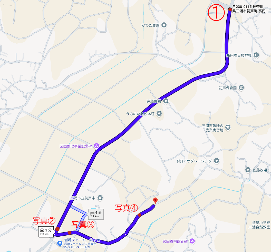 ①横浜横須賀道路、衣笠インターで降り、続けて三浦縦貫道路を通り高円坊出口へ